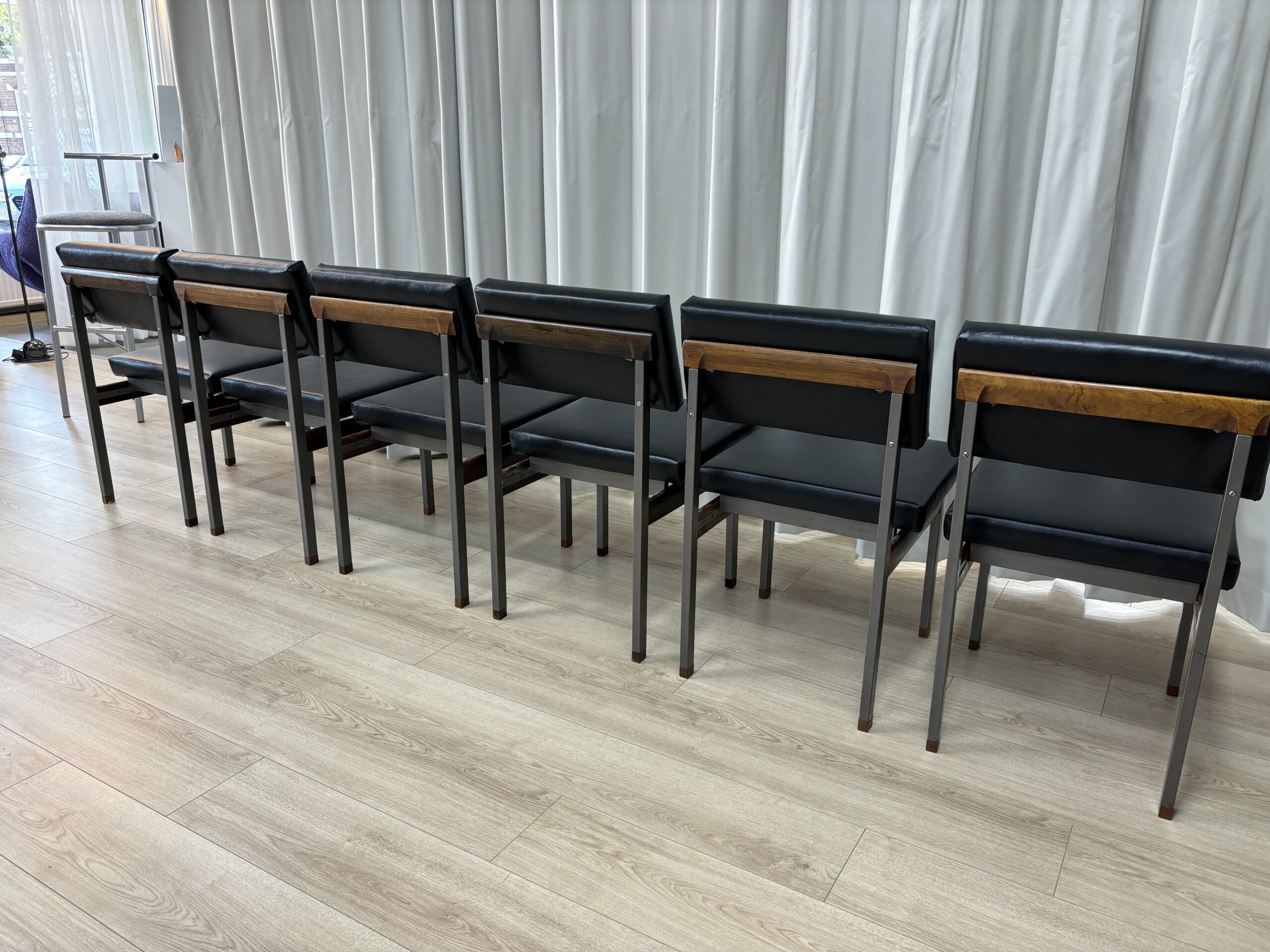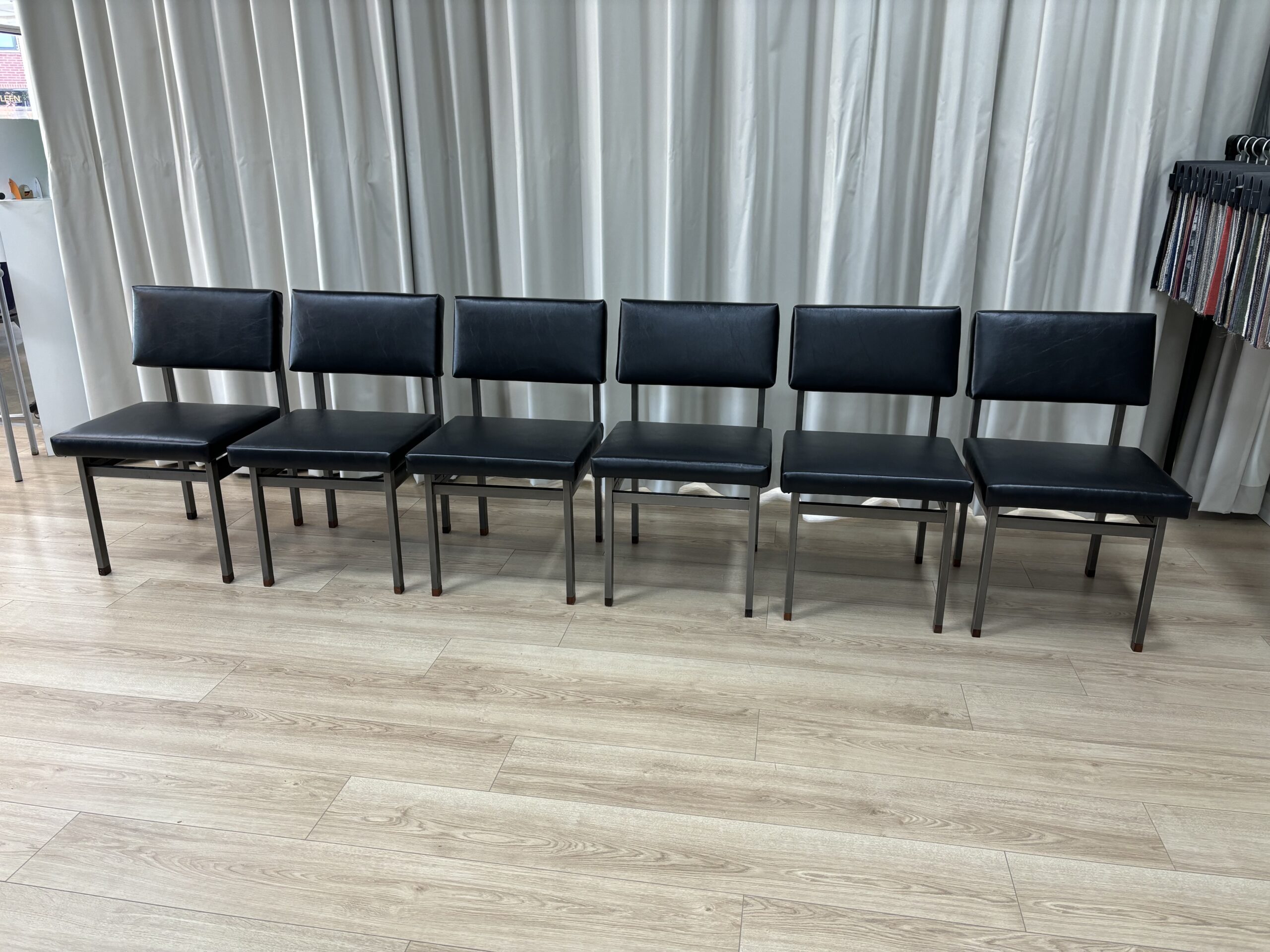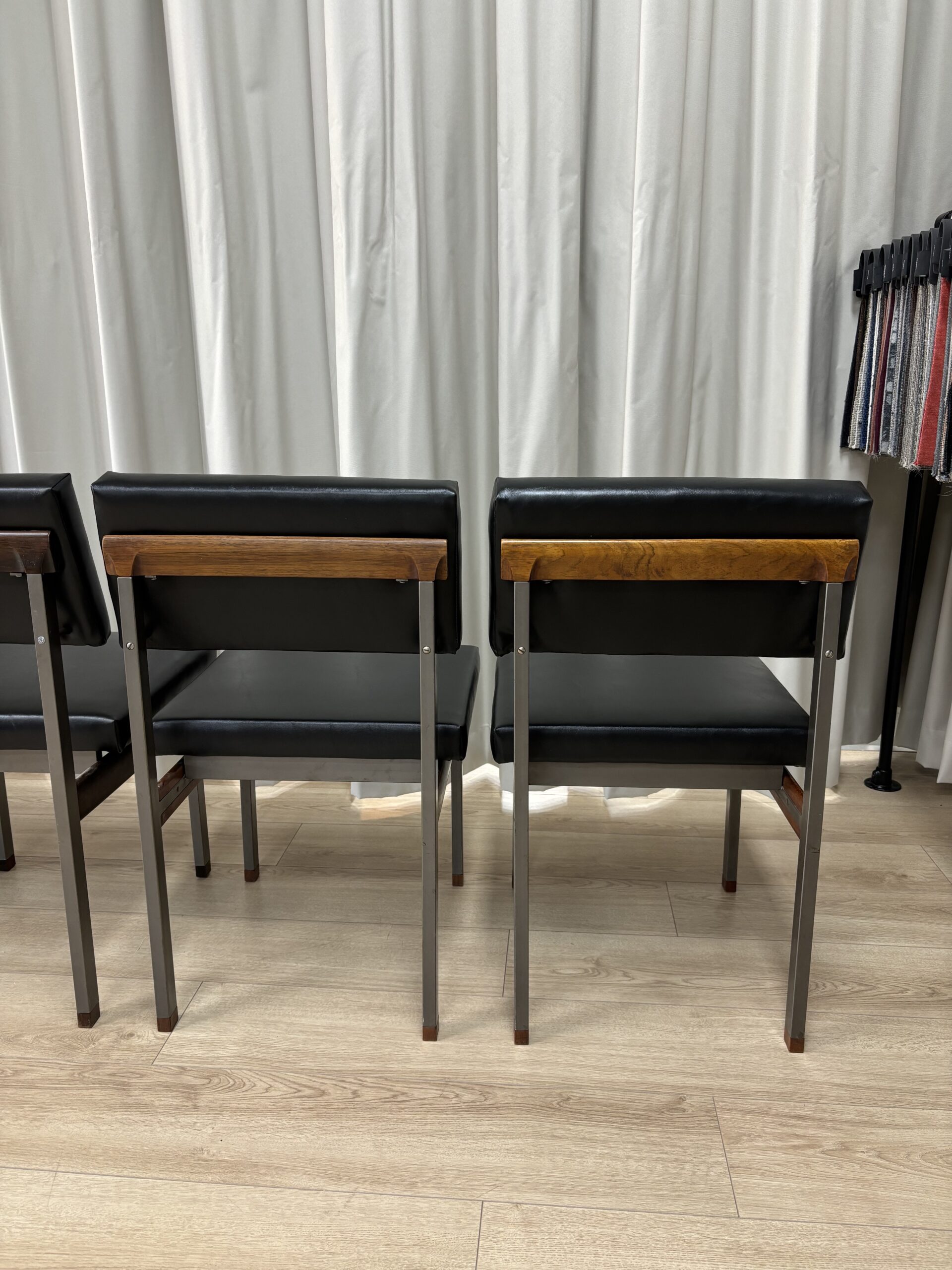 Deze stoelen zijn volledig opnieuw gestoffeerd in hoogwaardig zwart skai met een authentieke vintage look – perfect passend bij de stijl en het tijdperk. De frames verkeren in nette staat, klaar om direct aan tafel te schuiven.