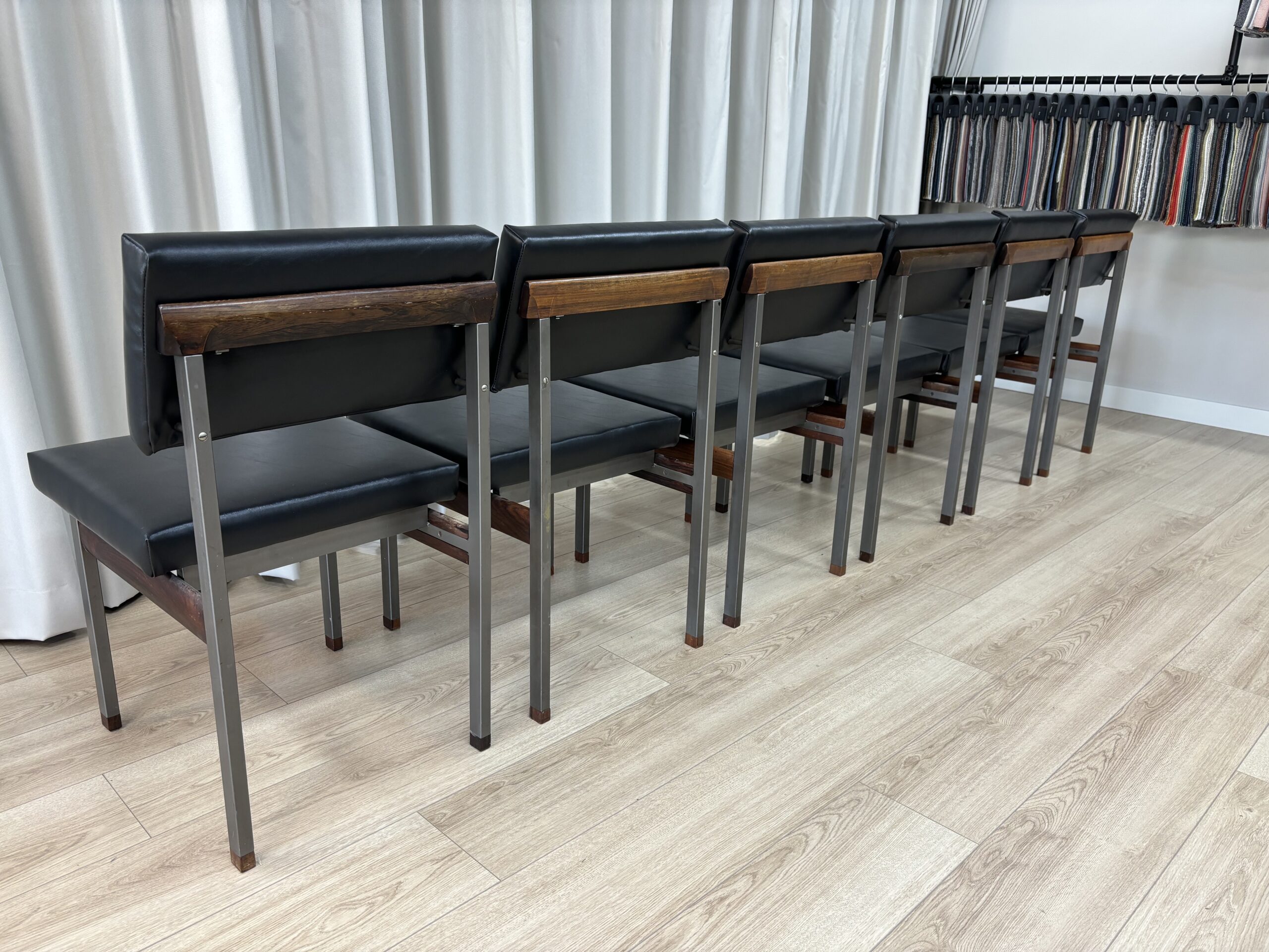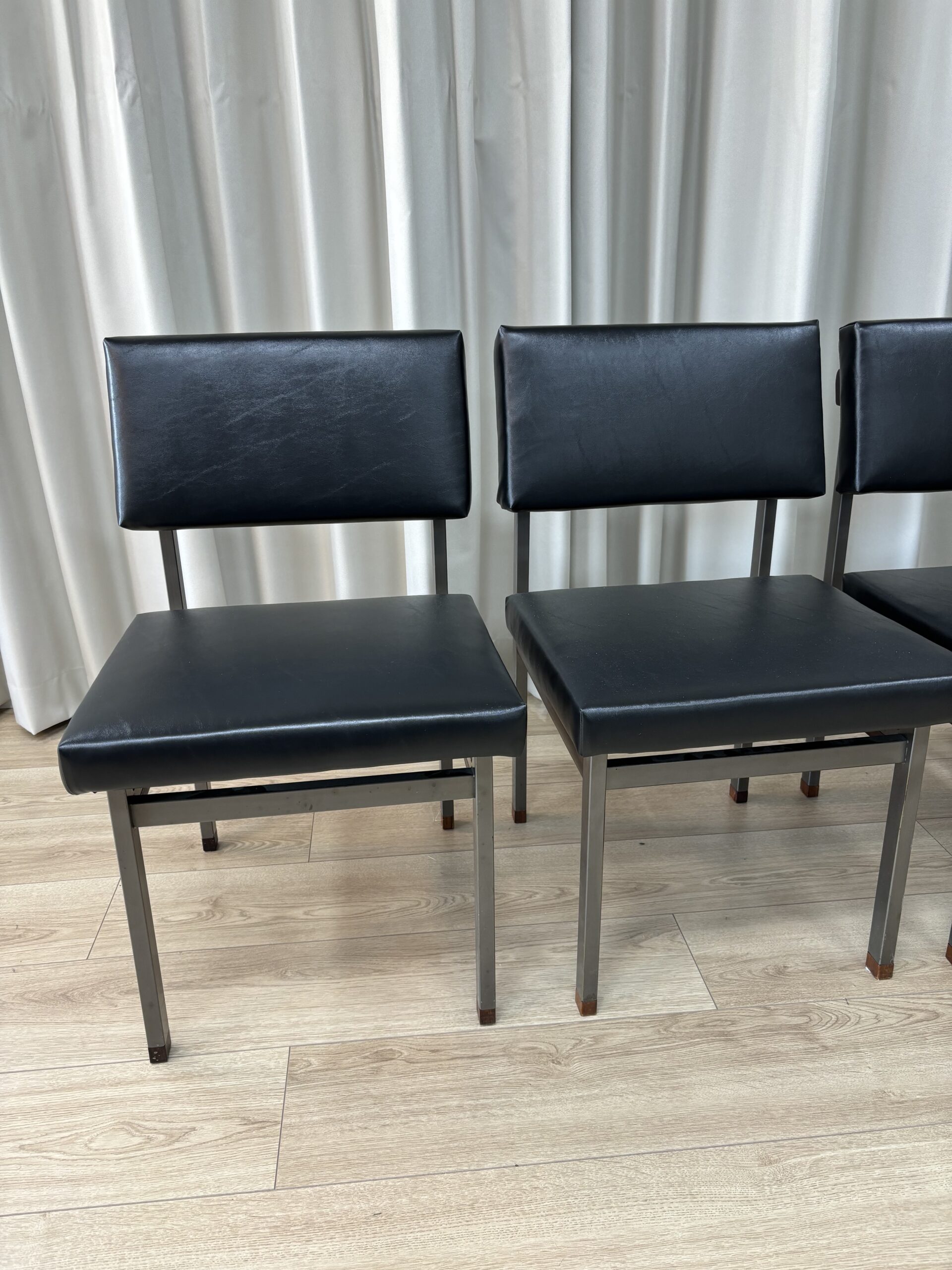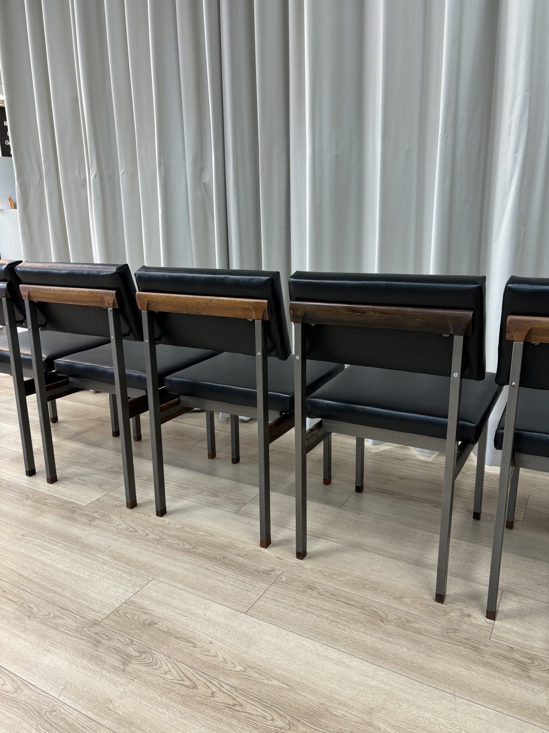 Deze stoelen zijn volledig opnieuw gestoffeerd in hoogwaardig zwart skai met een authentieke vintage look – perfect passend bij de stijl en het tijdperk. De frames verkeren in nette staat, klaar om direct aan tafel te schuiven.